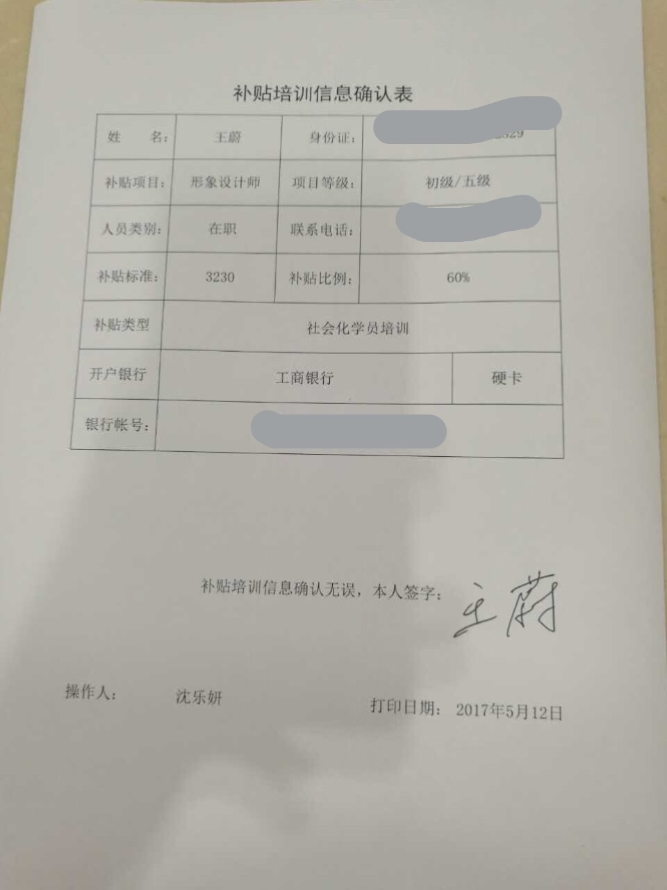 报名学员可以就近在上海各区就业促进中心办理绑定初级美容师这个培训项目,办理完毕后就业促进中心会给一张就业补贴培训确认表,如下图所示 :