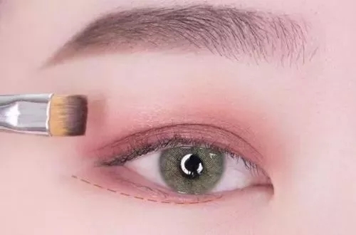Step3:在上眼睑的眼皮褶皱位置和外眼角的下方用粉色眼影涂抹。