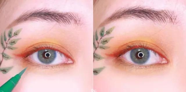 STEP5:接下来,给眼妆加一点创意~用绿色的眼线液笔在眼尾的空白区域画上一截精致的树枝图案,具体可以参考图片~(建议第一次画的小仙女们可以先在手上练练或者选择一些极简的图案,不然......你懂的!)