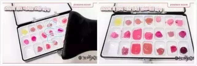 TIPS: 如果觉得一支支加热很麻烦,可以将唇膏分别切成小块(一定要注意控制大小)放入空格后,再使用吹风机,开热风,待固体口红慢慢融化~
