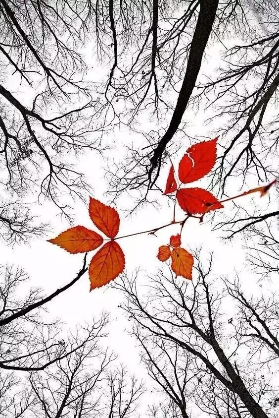 鲜红的叶子加上创意的广角仰拍,令枯燥的环境充满生气。