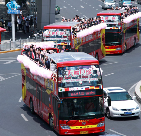 新人们都准备就绪,登上双层巴士,从东方明珠塔出发,途径世纪大道前往世纪公园拍摄外景